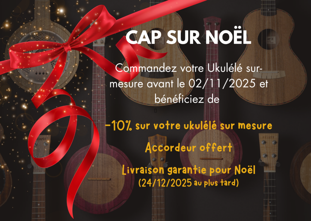 C’est pourquoi, pour toute commande d’un ukulélé sur-mesure avant le 02/11/2025, bénéficiez de -10% sur votre ukulélé, d’un accordeur offert et de la garantie d’être livrée à temps sous le sapin (le 24/12 au plus tard) !