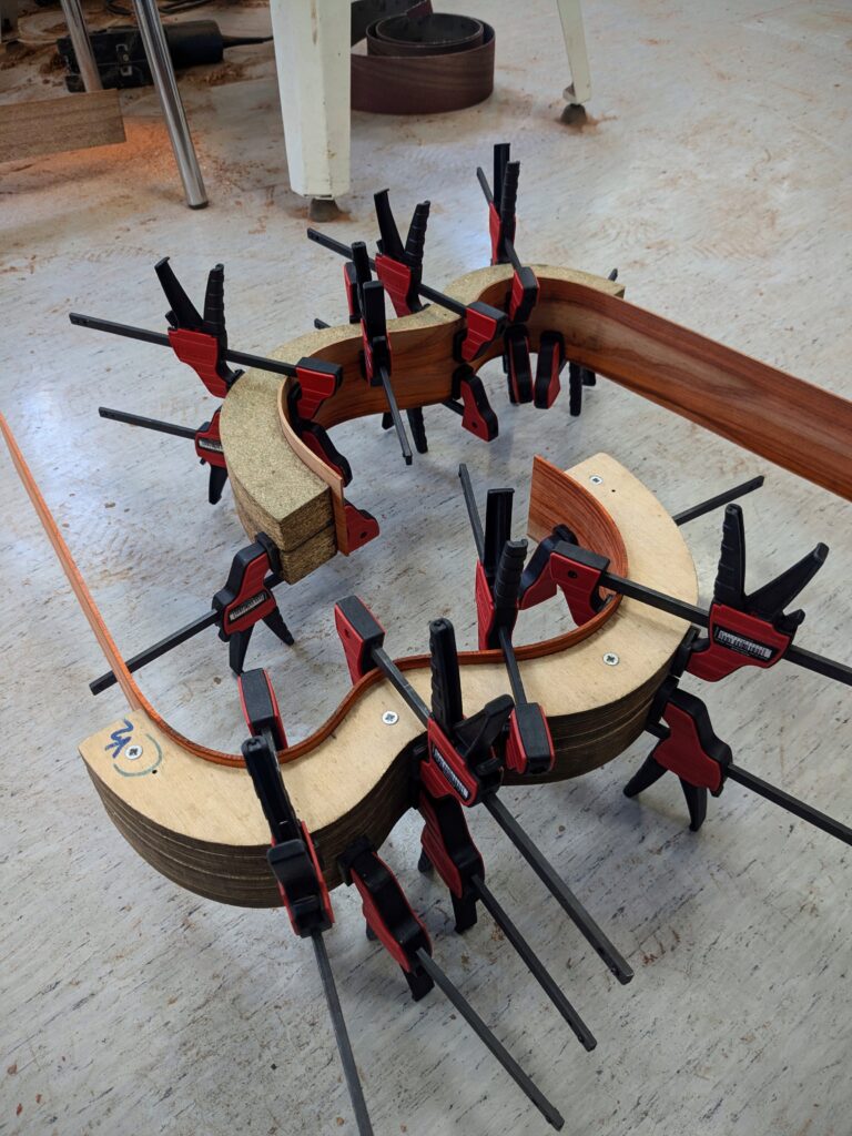– Corps (bois massif) :  Padouk Bariolé massif (Table d’harmonie, Dos et éclisses)