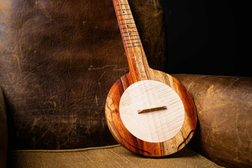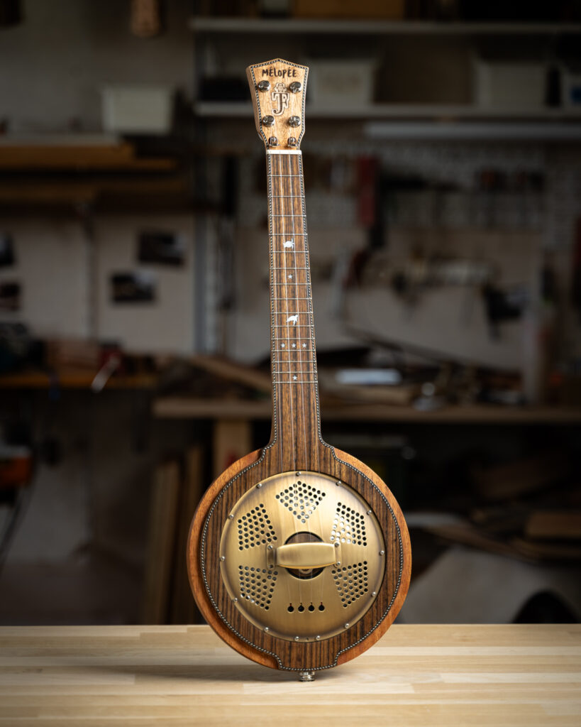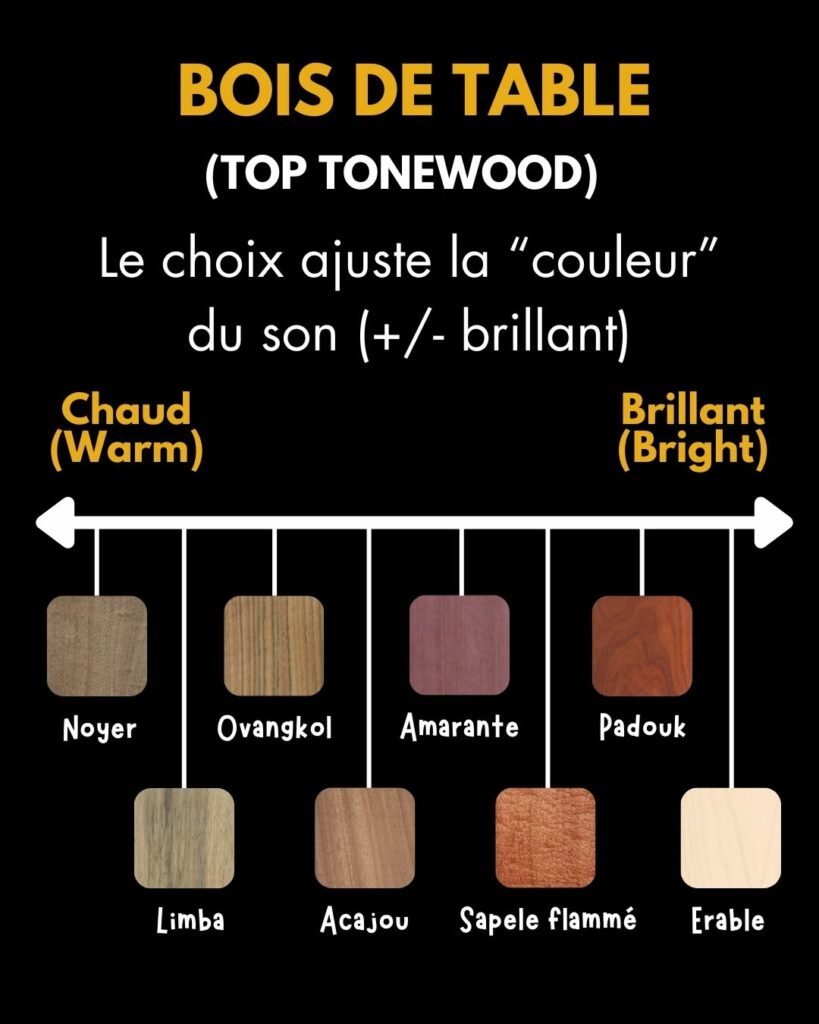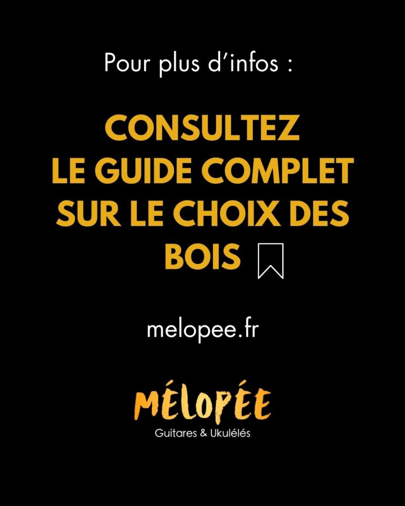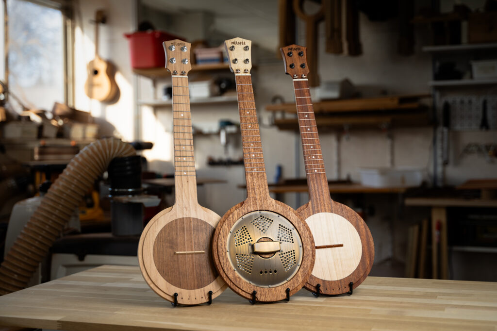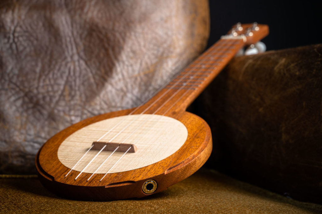 Dans sa version Standard, la table d’harmonie est en bois massif. Sa finesse lui permet d’agir comme une “membrane” et de délivrer un son sec et puissant comparable à celui d’un banjo ou banjolélé. Le choix de l’essence de bois utilisée façonne l’esthétique de l’instrument et permet de colorer légèrement le son, du plus rond au plus brillant.