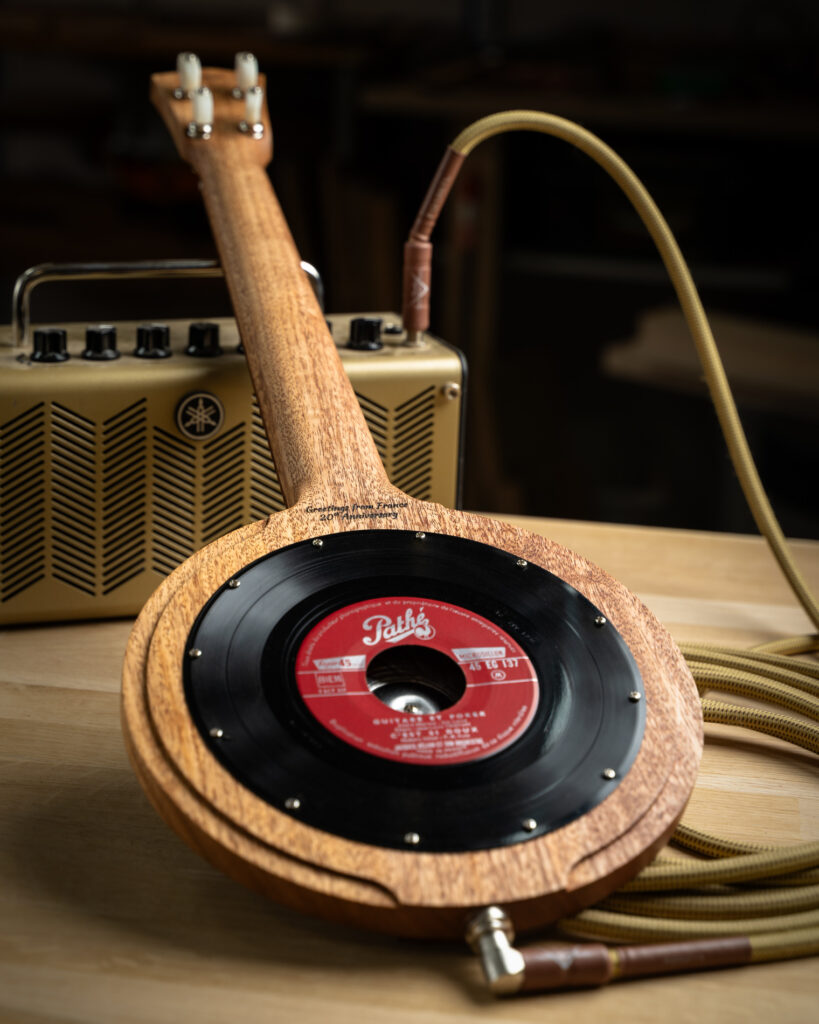 L’arrière de l’instrument est orné d’un véritable disque vinyl 45 tours. Outre la touche « Vintage » et l’unicité qu’il confère à l’instrument, le vinyl 45 tours permet de fermer la caisse de résonance et d’arrondir ainsi son enveloppe sonore.